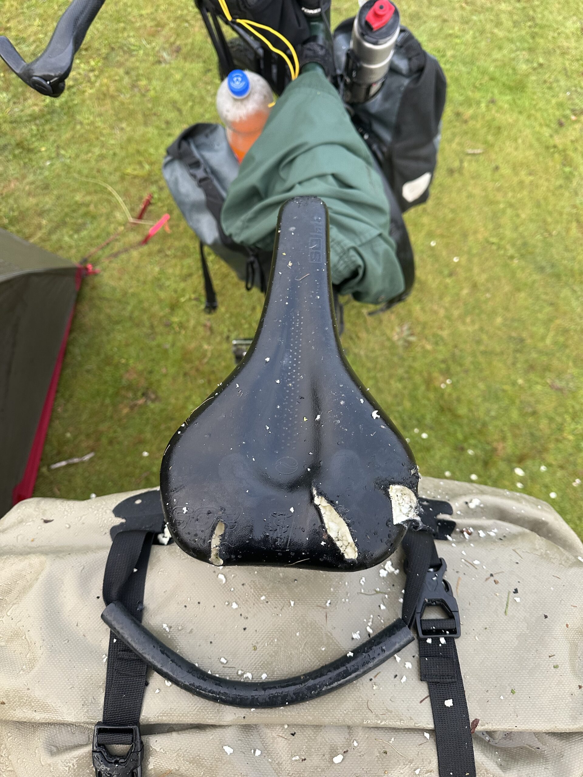 Anschließend setzte ich meine Fahrt fort, was glücklicherweise trotz des beschädigten Sattels noch möglich war. Unterwegs traf ich einen anderen Radreisenden, der mir seinen Sattel zeigte – dieser war vollständig zerbissen worden. Im Vergleich dazu war ich noch relativ glimpflich davongekommen. Dennoch hätte ich nicht erwartet, dass diese Vögel so großes Interesse daran haben, Materialien mit Weichmachern anzunagen.
