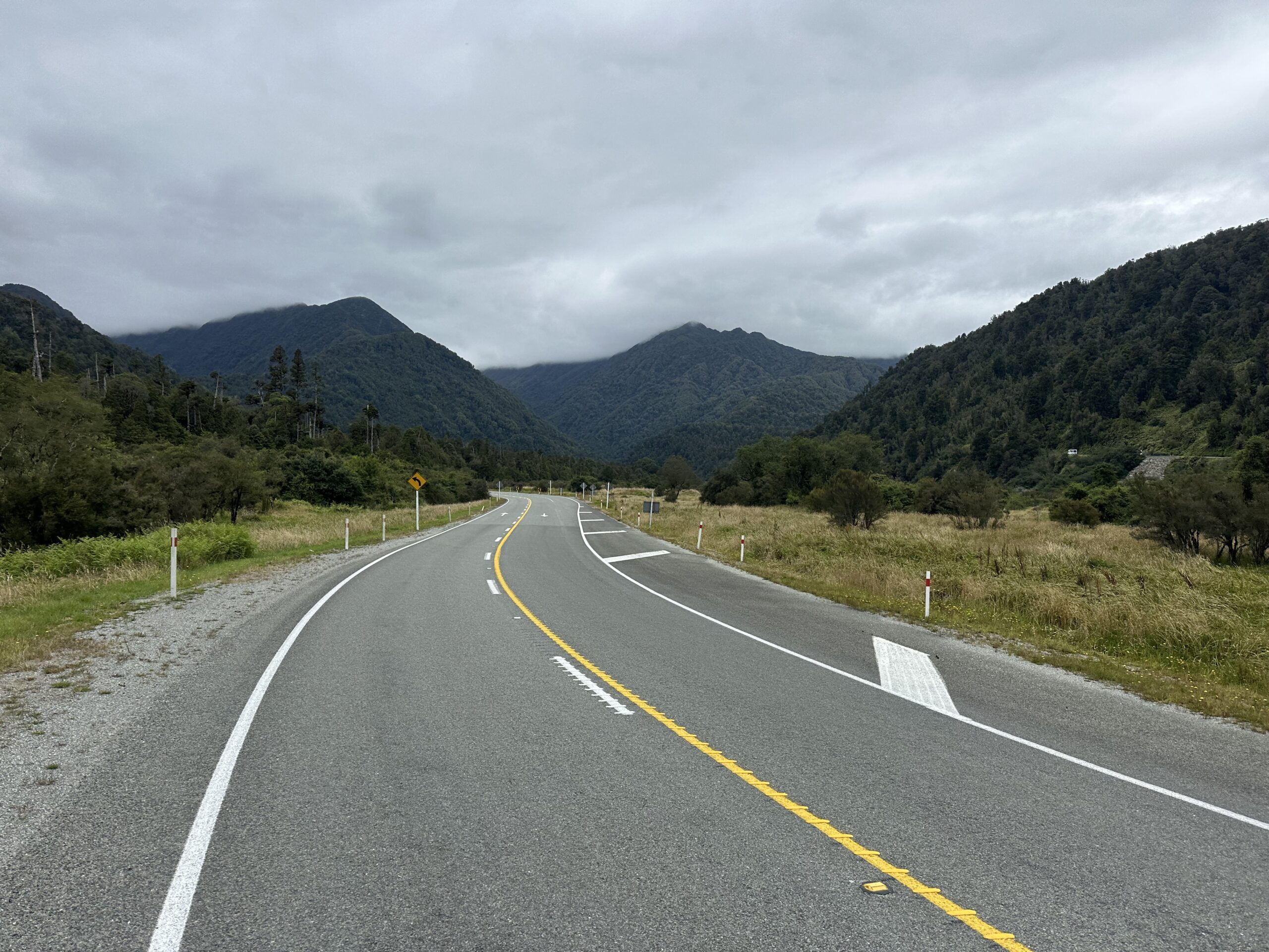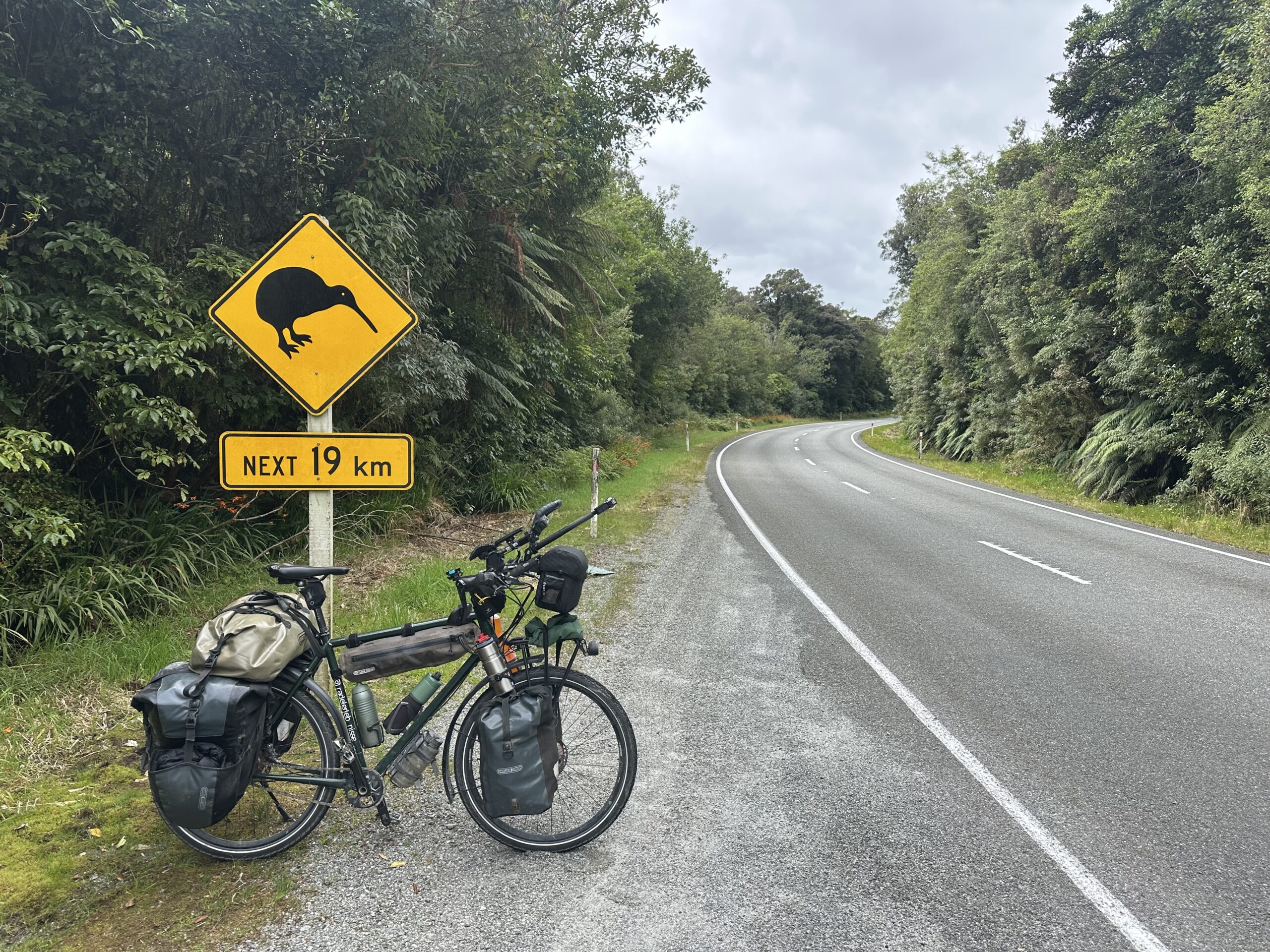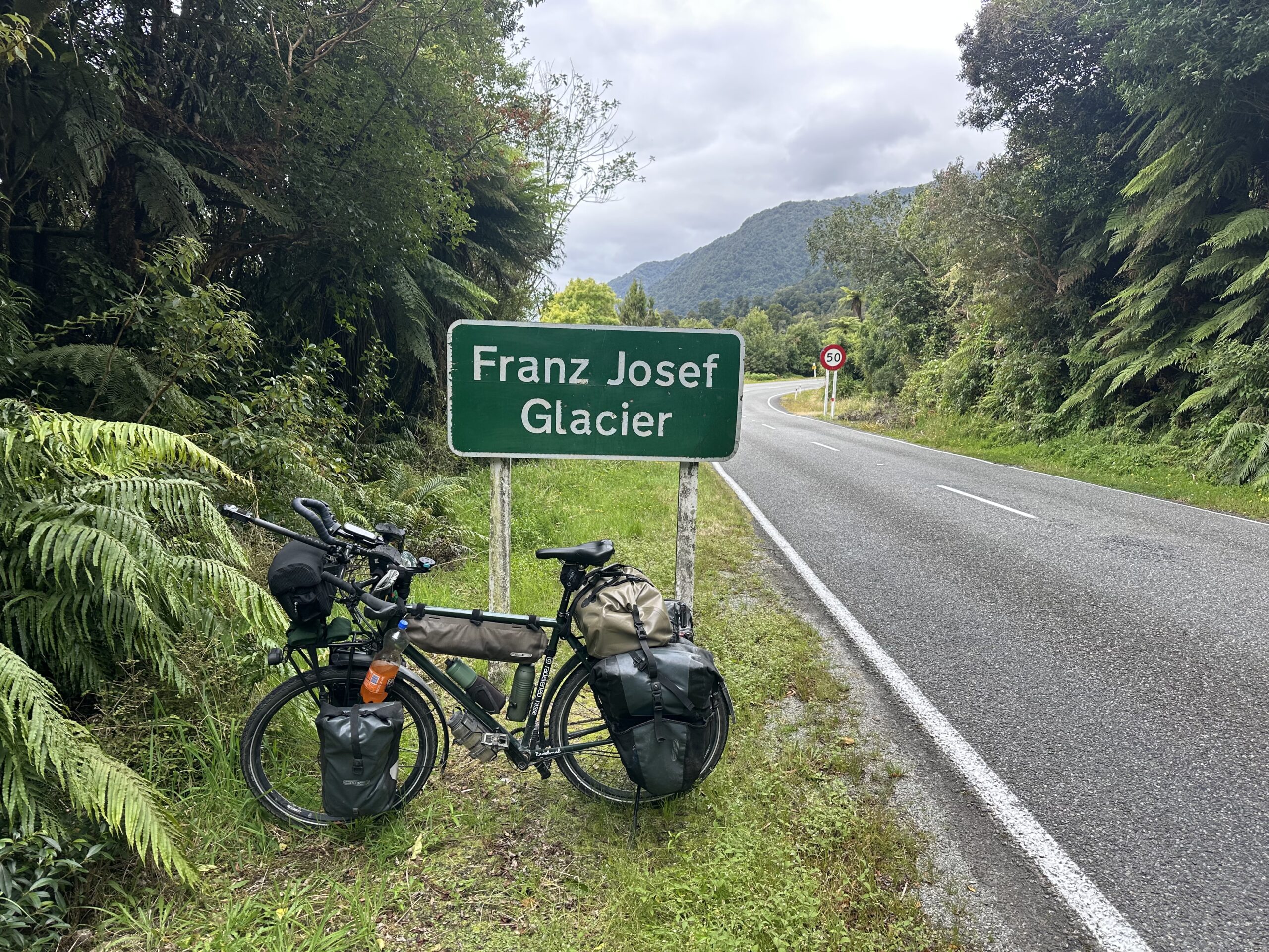 Die Strecke führte zunächst relativ flach entlang der Küste durch regenwaldähnliche Wälder. Auf den letzten 15 Kilometern warteten jedoch noch einmal rund 600 Höhenmeter, verteilt auf drei Anstiege. Im Ort beim Fox-Gletscher konnte ich mir glücklicherweise in einem kleinen Supermarkt noch eine Fanta kaufen, die mir den nötigen Energieschub gab, um die verbleibenden Anstiege zu bewältigen.