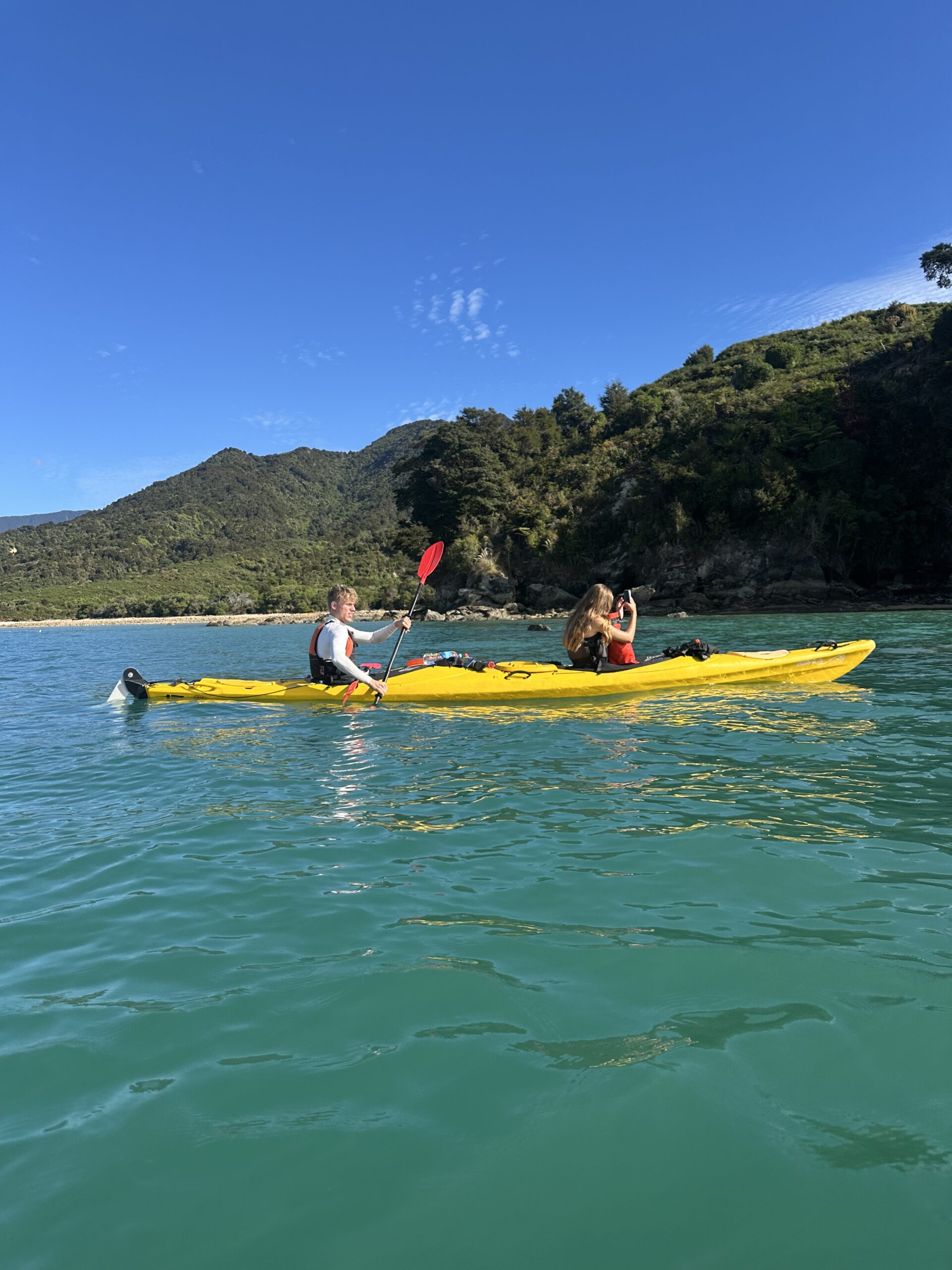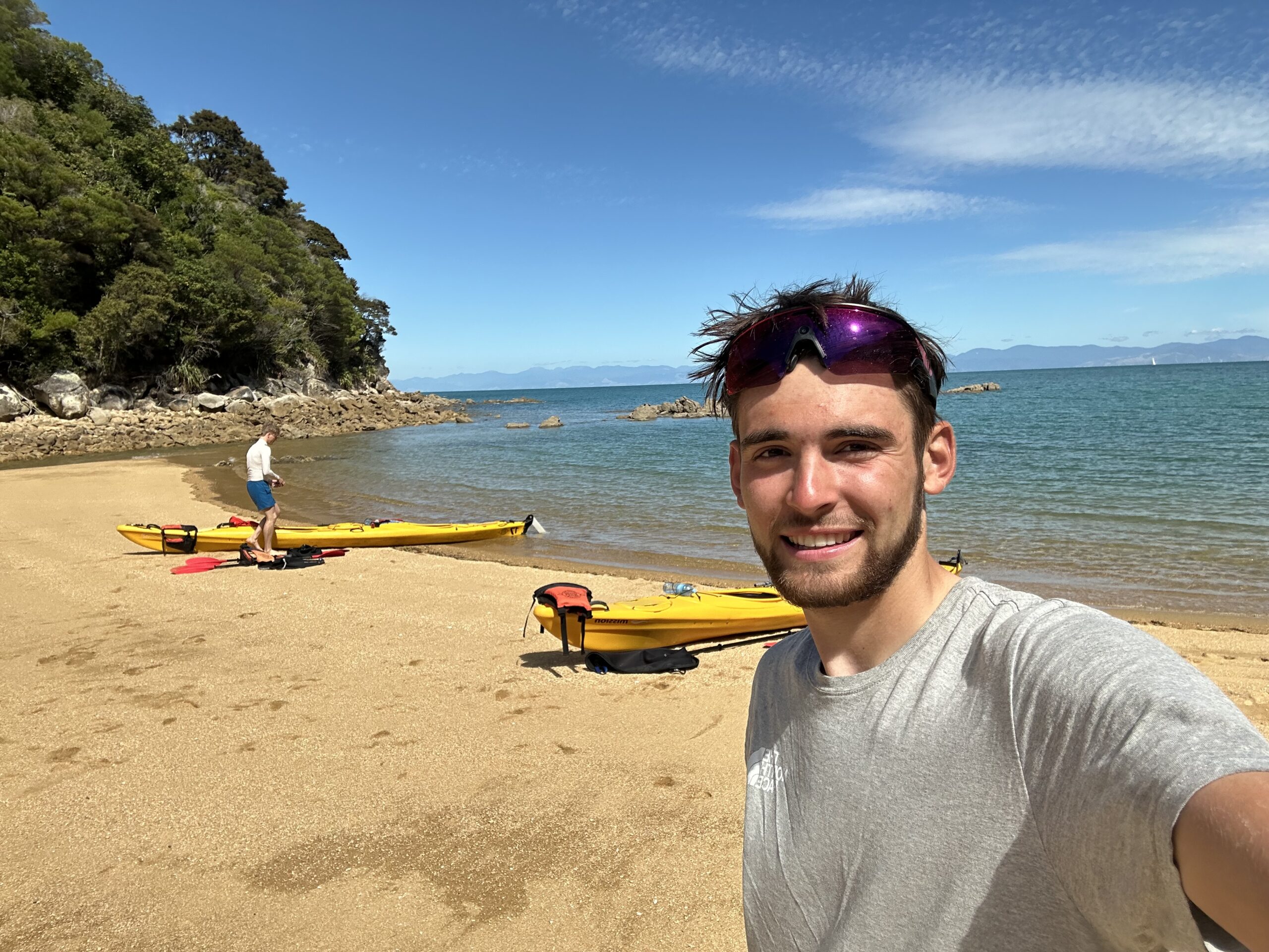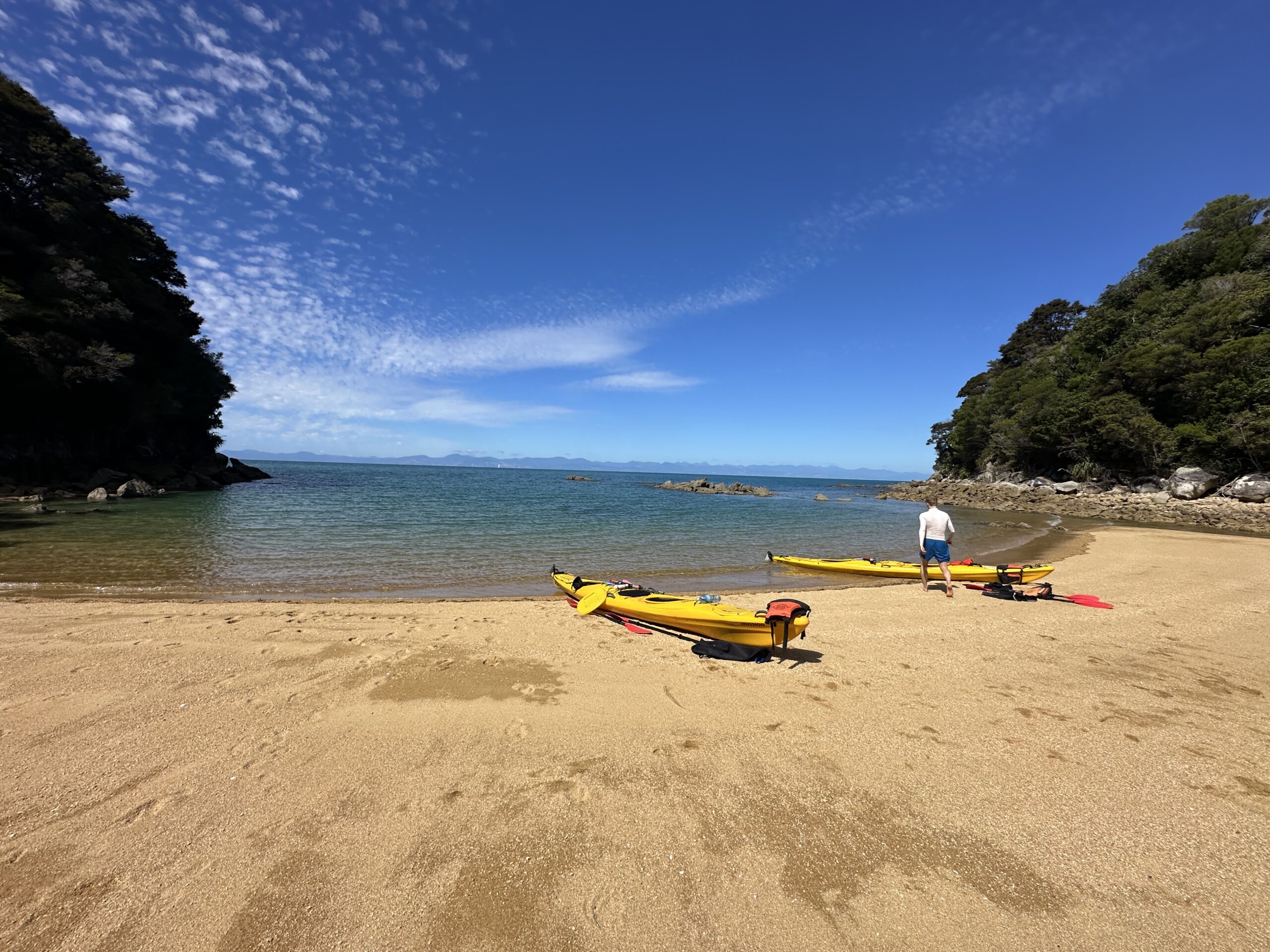 Heute ging es früh los. Wir fuhren zum Startpunkt des Abel-Tasman-Nationalparks nach Mārahau. Dort hatten wir bereits am Vortag Kajaks für den heutigen Morgen gebucht. Nach einer kurzen Autofahrt holten wir die Kajaks ab, nahmen an einem ausführlichen Sicherheitsbriefing teil und konnten anschließend, nachdem die Boote zu Wasser gelassen worden waren, selbstständig starten. In zwei Zweier-Teams paddelten wir entlang der traumhaften Buchten und Strände des Nationalparks.