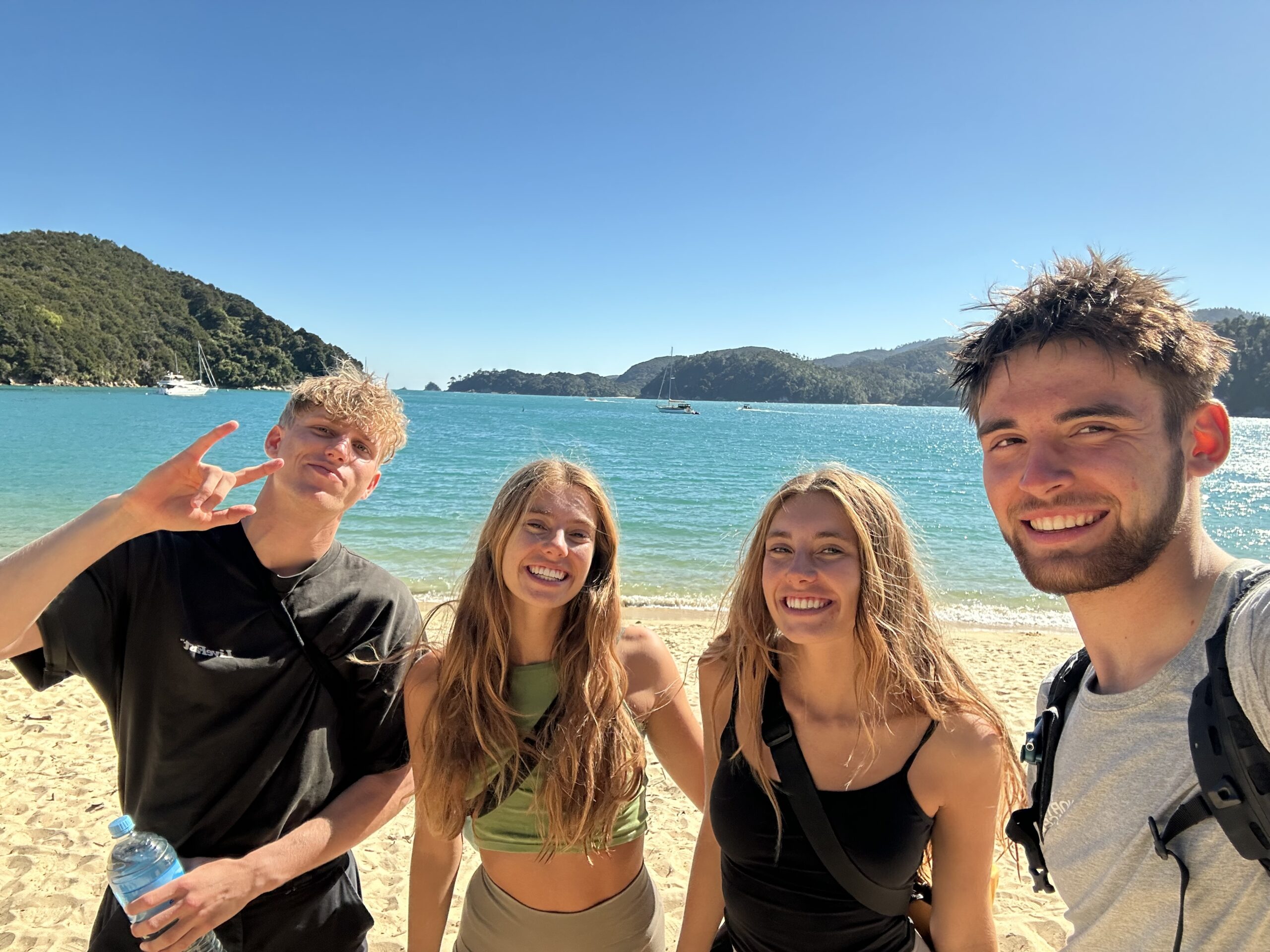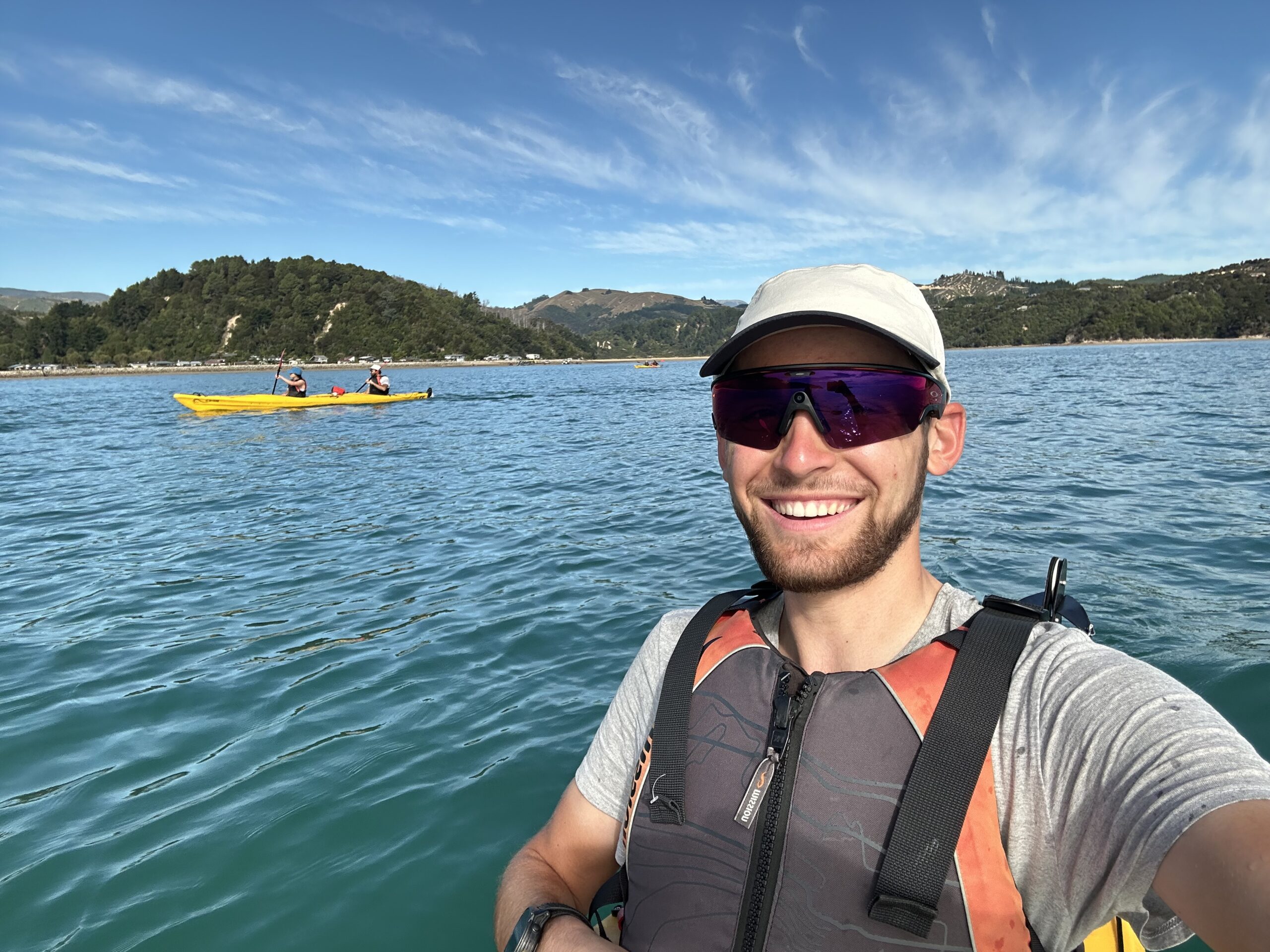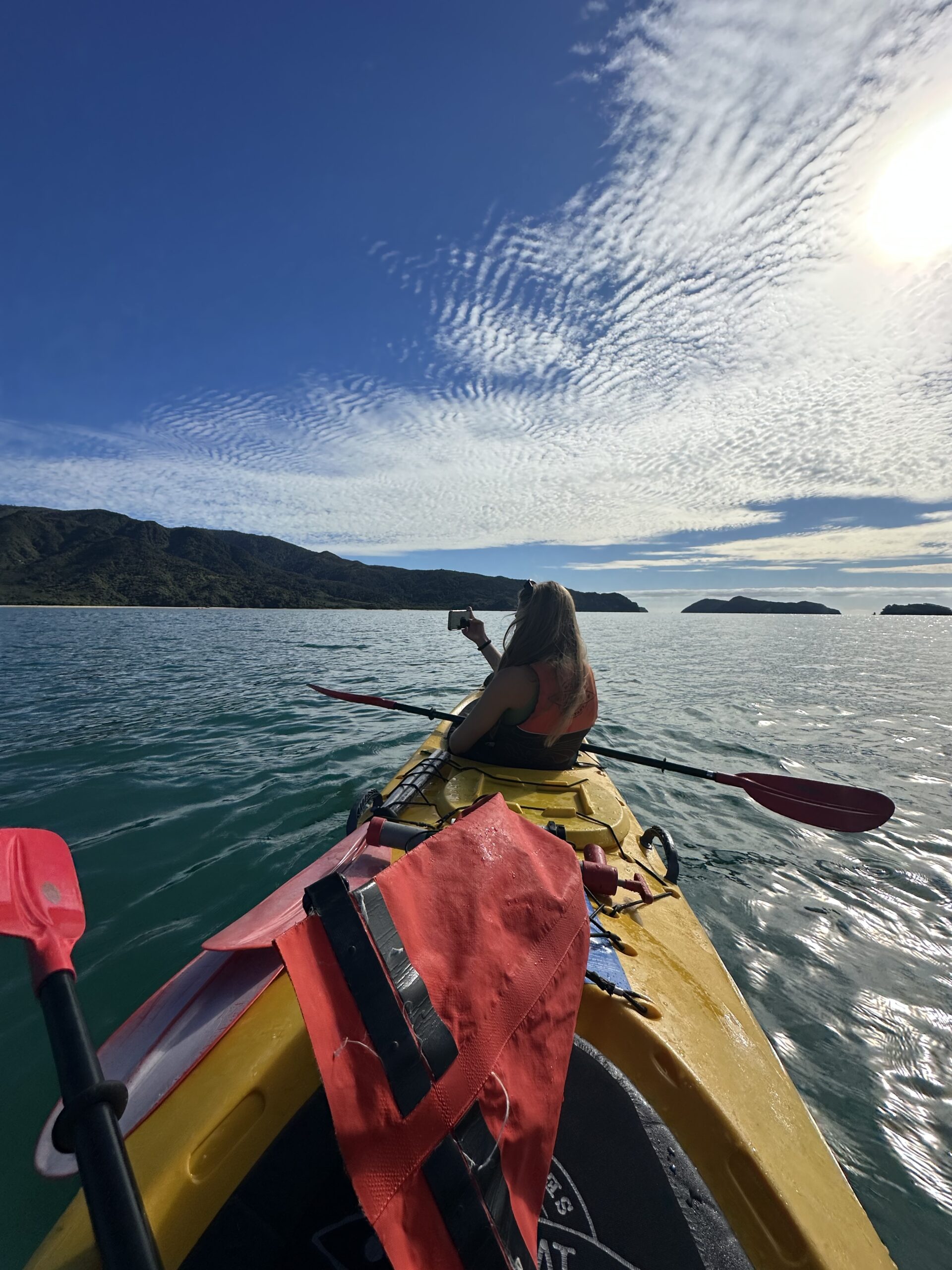 Heute ging es früh los. Wir fuhren zum Startpunkt des Abel-Tasman-Nationalparks nach Mārahau. Dort hatten wir bereits am Vortag Kajaks für den heutigen Morgen gebucht. Nach einer kurzen Autofahrt holten wir die Kajaks ab, nahmen an einem ausführlichen Sicherheitsbriefing teil und konnten anschließend, nachdem die Boote zu Wasser gelassen worden waren, selbstständig starten. In zwei Zweier-Teams paddelten wir entlang der traumhaften Buchten und Strände des Nationalparks.