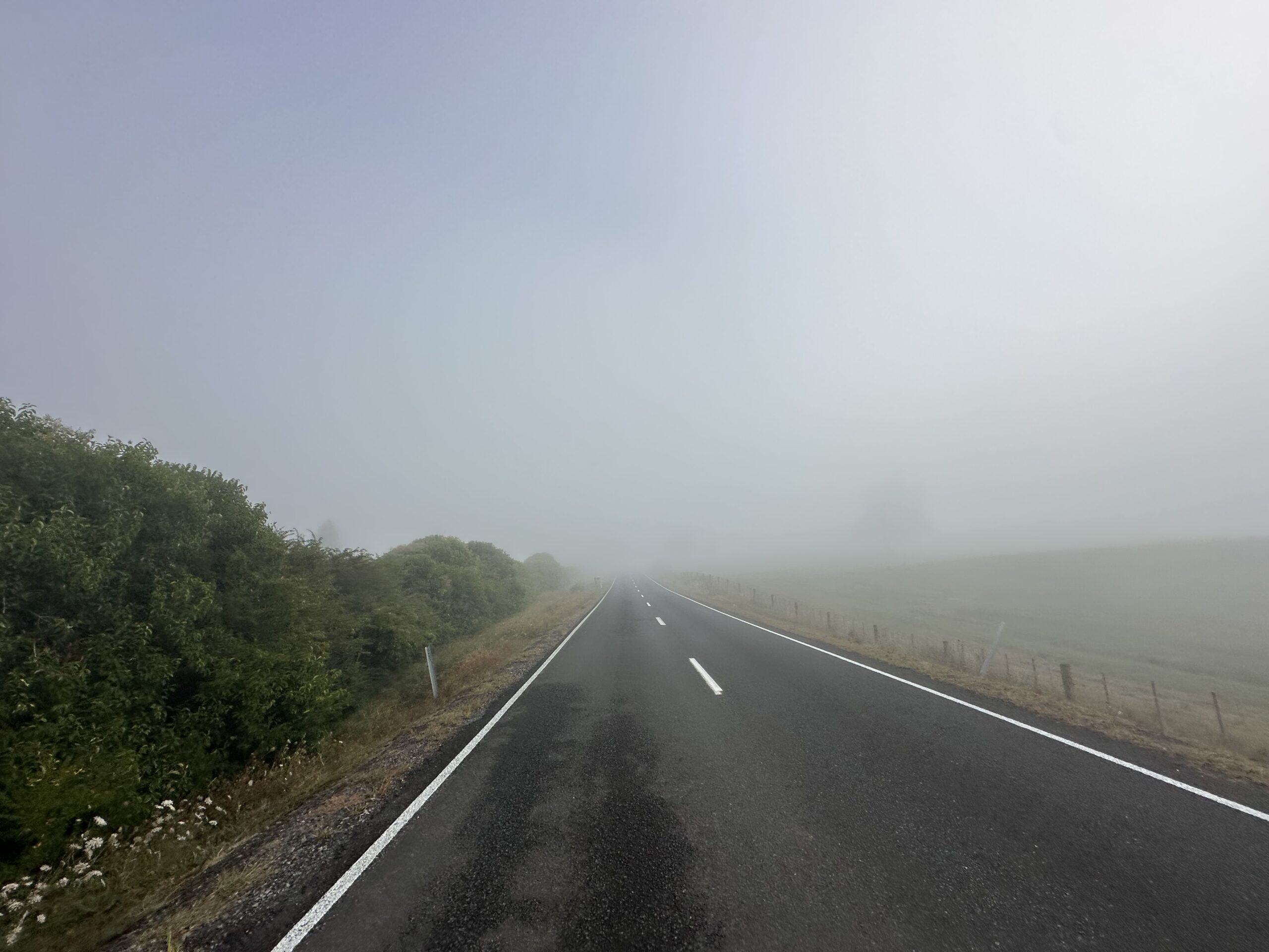 Zunächst fuhr ich durch dichten Nebel, doch je weiter ich mich vom See entfernte, desto mehr klarte es auf. Es folgte eine wunderschöne, grüne und hügelige Landschaft. Sobald die Sonne wieder durchkam, wurde sie schnell sehr intensiv. Besonders in Neuseeland ist die UV-Strahlung durch die dünnere Ozonschicht stärker, weshalb ich mich regelmäßig mit Sonnencreme schützte.