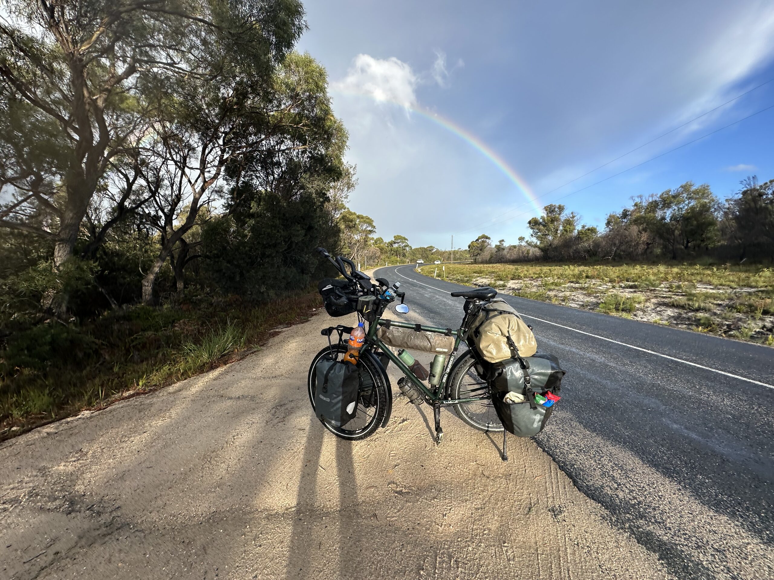 Am Himmel konnte ich bereits sehen, wie sich eine dunkle Wolkendecke vom Meer her näherte. Danach stellte ich mich mit meinem Fahrrad unter die Überdachung eines Toilettenhäuschens auf dem Campingplatz. Der Regen zog jedoch schneller weiter als gedacht, sodass ich nach meinem Frühstück schon bald losfahren konnte.
