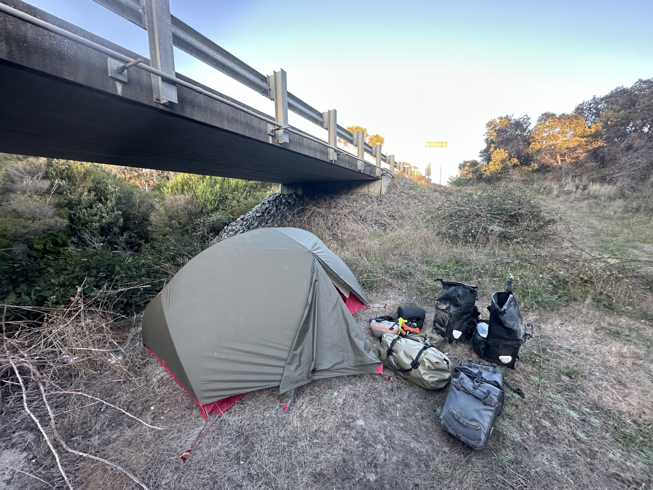 Nach etwa 30 km im gnadenlosen Gegenwind war klar: Für heute reicht es. Ich suchte einen Schlafplatz und fand schließlich unter einer Brücke an einem kleinen Fluss einen perfekten Spot. Ein echter Glücksfall, denn die umliegenden Flächen waren – wie so oft – komplett eingezäunt.